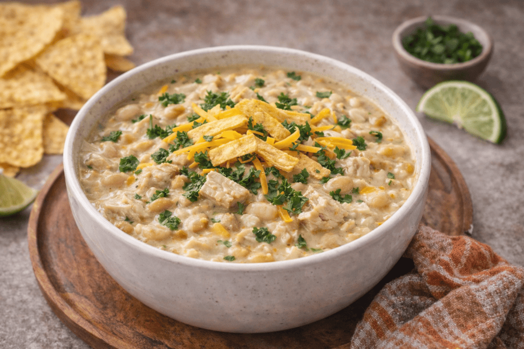 This white chicken chili with cream cheese is cozy, filling, and exactly what busy nights call for.